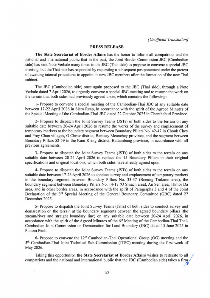Cambodia’s State Secretariat of Border Affairs sent Thailand a Note Verbale proposing a special Joint Boundary Commission meeting in Siem Reap between 17 and 22 April, deployment of Joint Survey Teams to four boundary segments between 20 and 24 April, and convening of the 12th bilateral Operational Group and 5th Joint Technical Sub-Commission in the first week of May. One of the segments named was O’Smach, at Boundary Pillars 14-17.