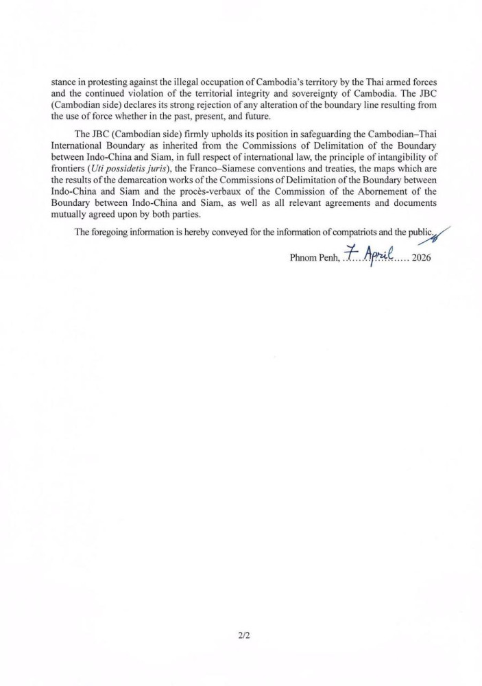 Also on 7 April, Thailand’s cabinet approved its policy statement for delivery to Parliament, with the session expected from 7 to 10 April. That statement includes the formal cancellation of the 2001 Memorandum of Understanding on maritime boundaries. The 2000 MOU on land boundaries, which created the JBC mechanism Cambodia is seeking to activate, remains “under consideration,” according to Prime Minister Anutin Charnvirakul.